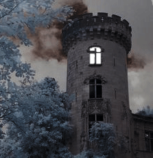 Så småningom fortsätter vi vägen fram och vänder sedan där den tar slut. När vi återigen passerar huset med tornet stannar vi. Det är fortfarande tänt och vi pratar om hur fint det ser ut. De borde ha tänt varje natt. Jag tycker att gardinen rör sig och att någon tittar ner på oss. Jag tror att jag vinkar lite med ficklampan.